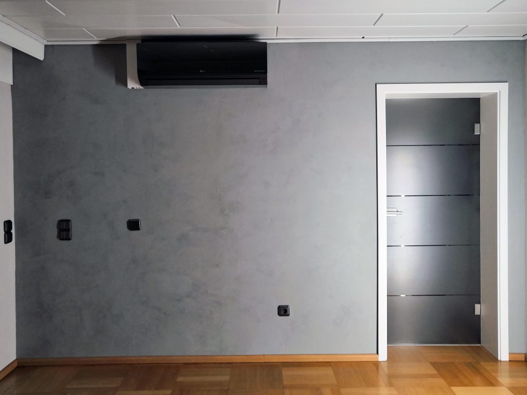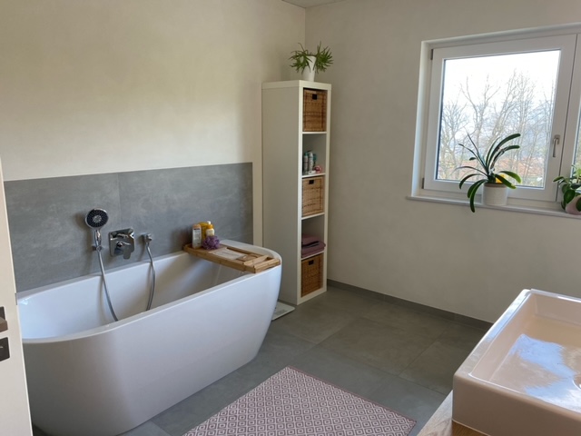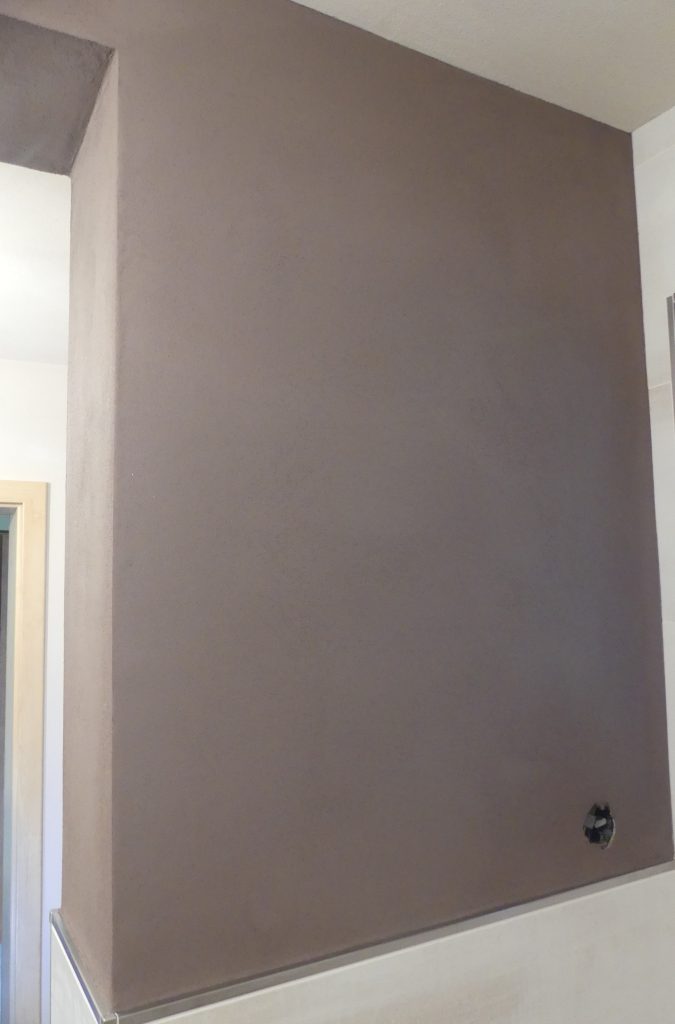 Lehmwand in einem Badezimmer (Edelputz Ardesia von Conluto)
